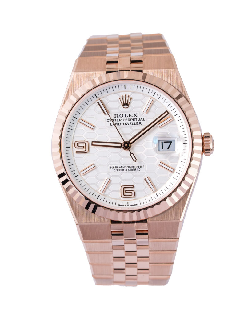 brand: Rolex Reference: 127335 Model: Land-Dweller case MATERIAL: Rose Gold strap: Bracelet case Size (MM): 40mm Dial colour: White Bezel: Rose Gold Year: 01/2026 Condition: Unworn Box papers : Paperwork/box