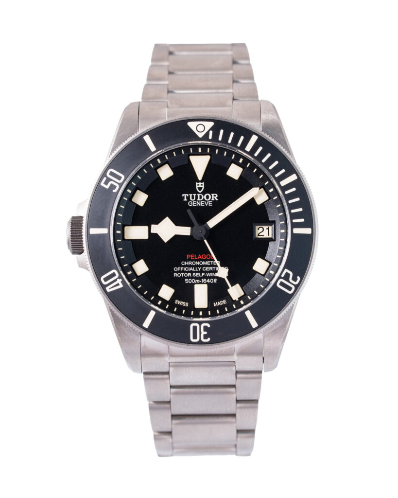 brand: Tudor Reference: 25610TNL Model: Pelagos case MATERIAL: Titanium strap: Bracelet case Size (MM): 42mm Dial colour: Black Bezel: Steel Condition: Excellent Box papers : Paperwork/box