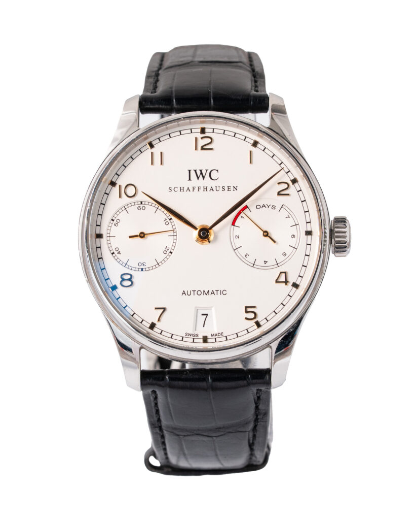 brand: IWC Reference: IW500114 Model: Portuguese Automatic case MATERIAL: Steel strap: Leather case Size (MM): 42.3mm Dial colour: White Bezel: Steel Year: 04/2015 Condition: Excellent Box papers : Paperwork/box