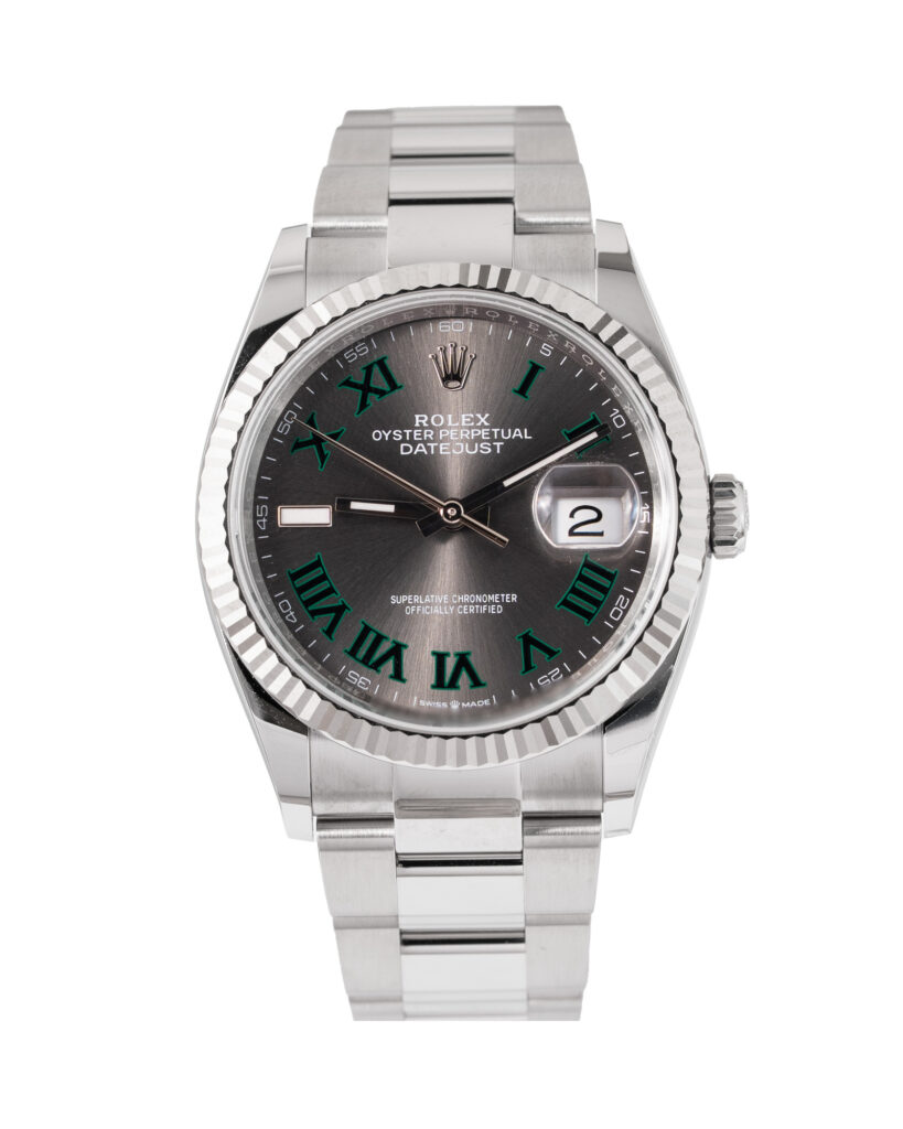 brand: Rolex Reference: 126234 Model: Datejust case MATERIAL: Steel strap: Bracelet case Size (MM): 36mm Dial colour: Green Bezel: White Gold Year: 12/2025 Condition: Unworn Box papers : Paperwork/box