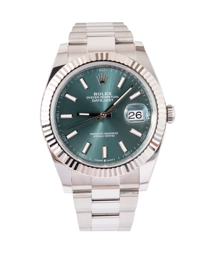 brand: Rolex Reference: 126334 Model: Datejust case MATERIAL: Steel strap: Bracelet case Size (MM): 41mm Dial colour: Green Bezel: White Gold Year: 08/2025 Condition: Excellent Box papers : Paperwork/box