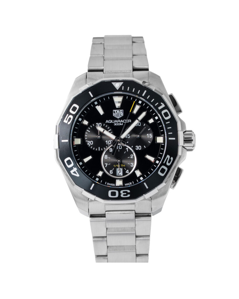 brand: Tag Heuer Reference: CAY111A Model: Aquaracer 300M case MATERIAL: Steel strap: Bracelet case Size (MM): 43mm Dial colour: Black Bezel: Steel Year: 06/2020 Condition: Excellent Box papers : Paperwork/box