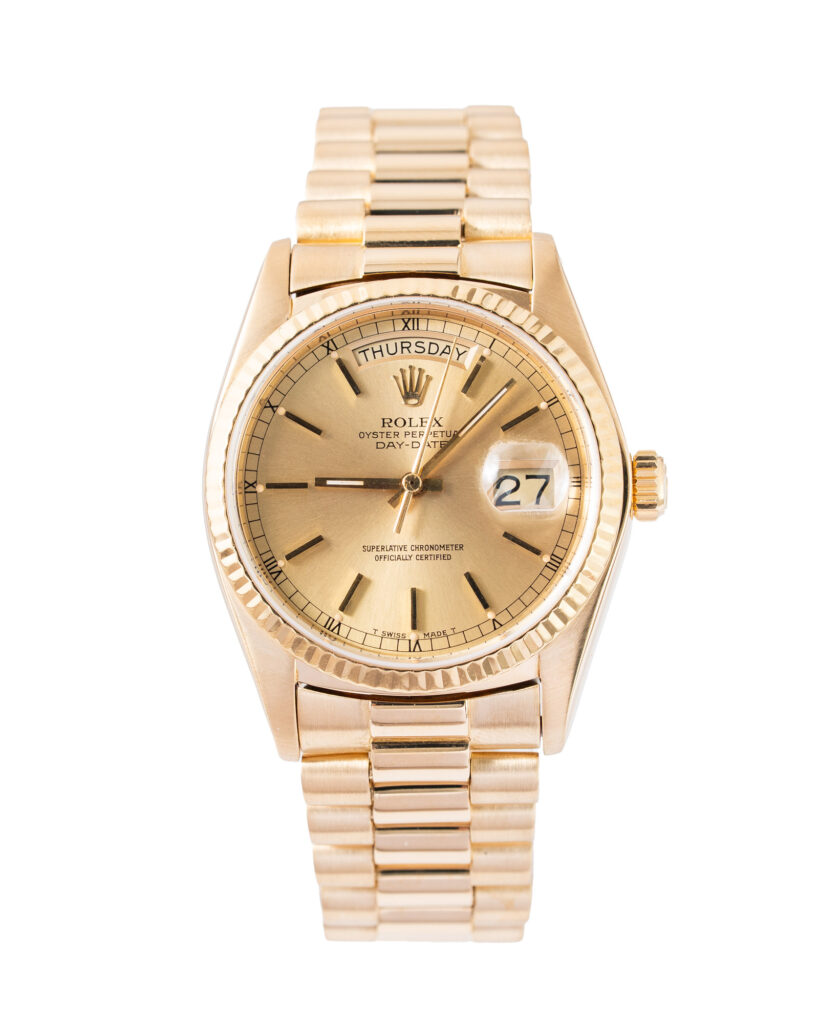 brand: Rolex Reference: 18038 Model: Day-Date case MATERIAL: Yellow Gold strap: Bracelet case Size (MM): 36mm Dial colour: Champagne Bezel: Yellow Gold Condition: Good Box papers : Watch Only