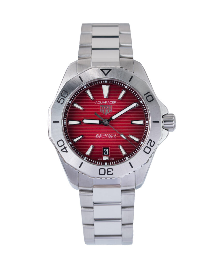 brand: Tag Heuer Reference: WBP2114.BA0627 Model: Aquaracer case MATERIAL: Steel strap: Bracelet case Size (MM): 40mm Dial colour: Red Bezel: Steel Condition: Excellent Box papers : Paperwork/box