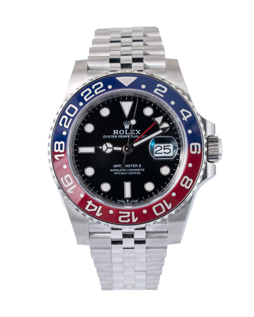 brand: Rolex Reference: 126710BLRO Model: GMT-Master II case MATERIAL: Steel strap: Bracelet case Size (MM): 40mm Dial colour: Black Bezel: Ceramic Condition: Excellent Box papers : Box