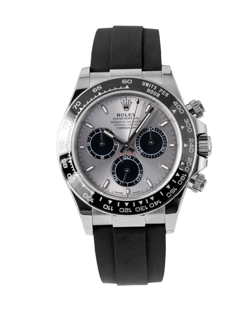 brand: Rolex Reference: 126519LN Model: Daytona case MATERIAL: White Gold strap: Rubber case Size (MM): 40mm Dial colour: Grey Bezel: Ceramic Year: 04/2024 Condition: Excellent Box papers : Paperwork/box