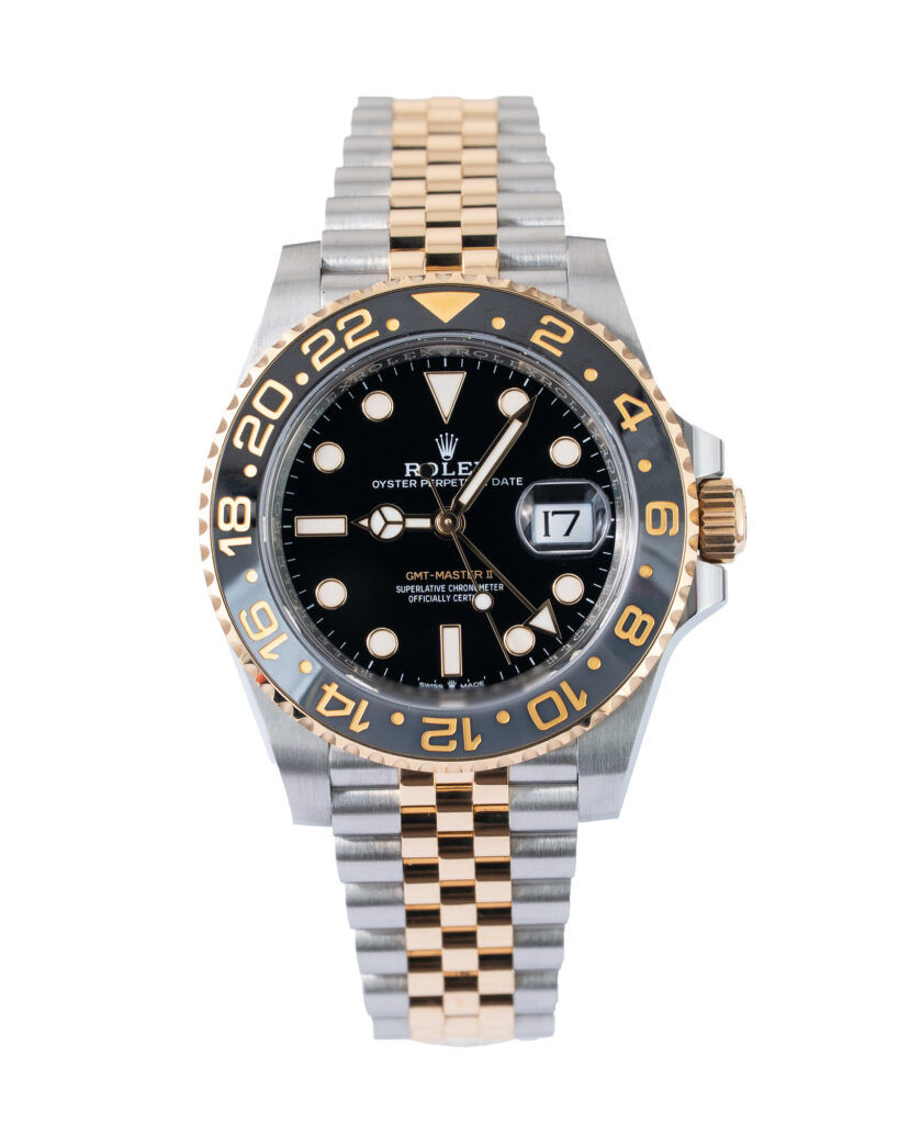 brand: Rolex Reference: 126713GRNR Model: GMT-Master II case MATERIAL: Steel & Yellow Gold strap: Bracelet case Size (MM): 40mm Dial colour: Black Bezel: Ceramic Year: 03/2024 Condition: Excellent Box papers : Paperwork/box