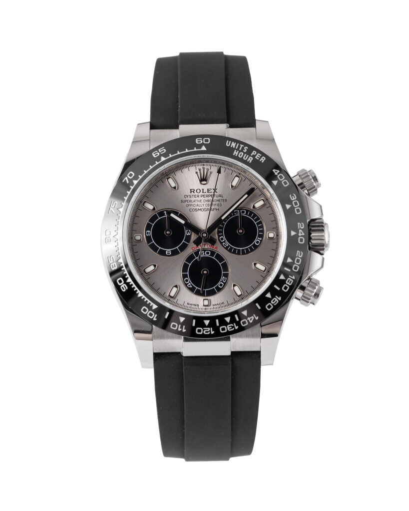 brand: Rolex Reference: 116519LN Model: Daytona case MATERIAL: White Gold strap: Rubber case Size (MM): 40mm Dial colour: Silver Bezel: Ceramic Condition: Excellent Box papers : Paperwork/box