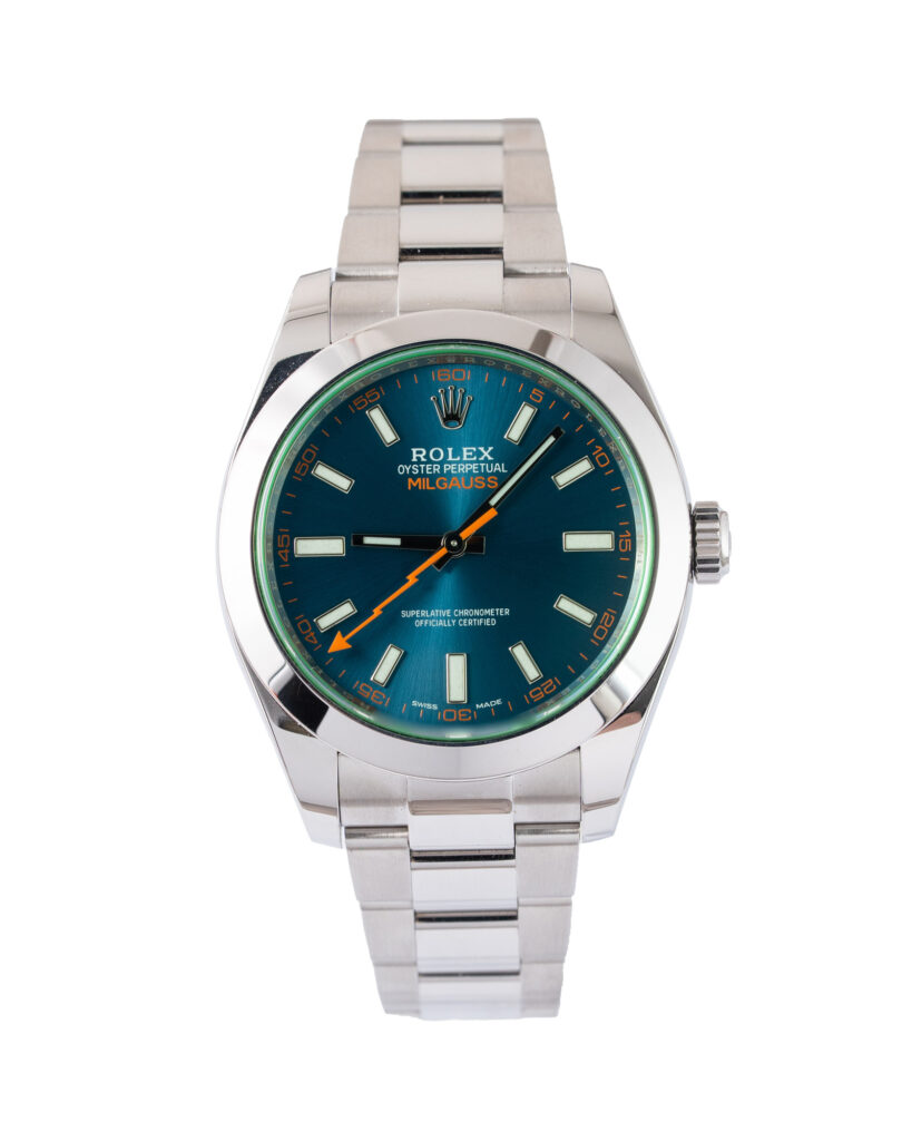 brand: Rolex Reference: 116400GV Model: Milgauss case MATERIAL: Steel strap: Bracelet case Size (MM): 40mm Dial colour: Blue Bezel: Steel Condition: Excellent Box papers : Paperwork/box