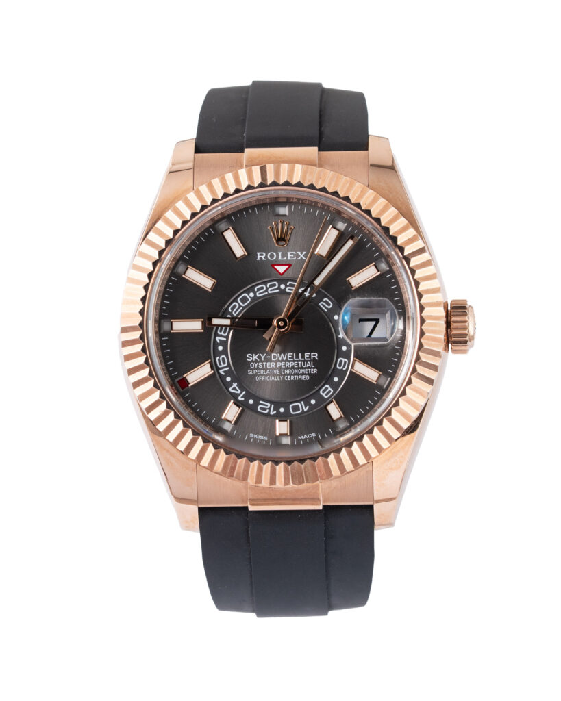 brand: Rolex Reference: 326235 Model: Sky-Dweller case MATERIAL: Rose Gold strap: Rubber case Size (MM): 42mm Dial colour: Grey Bezel: Rose Gold Condition: Excellent Box papers : Paperwork/box