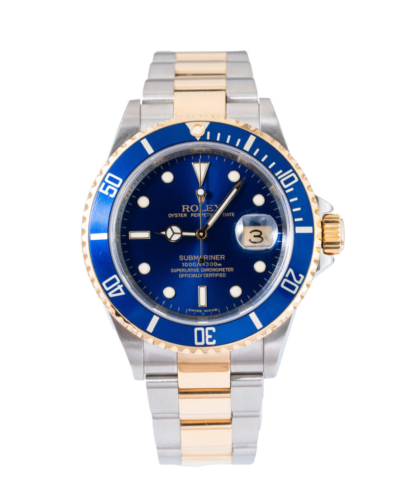 brand: Rolex Reference: 16613 Model: Submariner case MATERIAL: Steel & Yellow Gold strap: Bracelet case Size (MM): 40mm Dial colour: Blue Bezel: Steel Year: 08/2009 Condition: Excellent Box papers : Paperwork/box