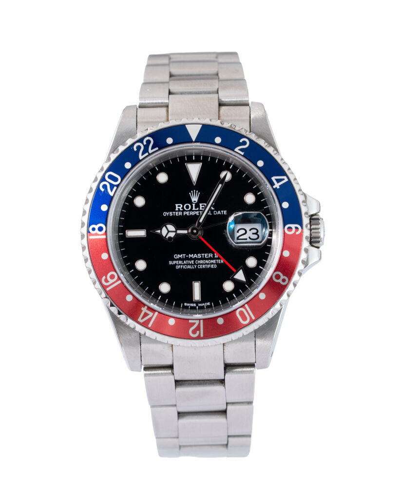 brand: Rolex Reference: 16710 Model: GMT-Master II case MATERIAL: Steel strap: Bracelet case Size (MM): 40mm Dial colour: Black Bezel: Steel Year: 05/2001 Condition: Excellent Box papers : Service Paper/box