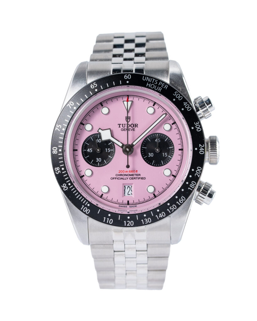 Make: Tudor Reference: 79360N Model: Black Bay Chrono Case: Steel Bracelet: Bracelet Size: 41mm Dial colour: Pink Bezel: Ceramic (CRM) Condition: Excellent Box papers : Paperwork/box