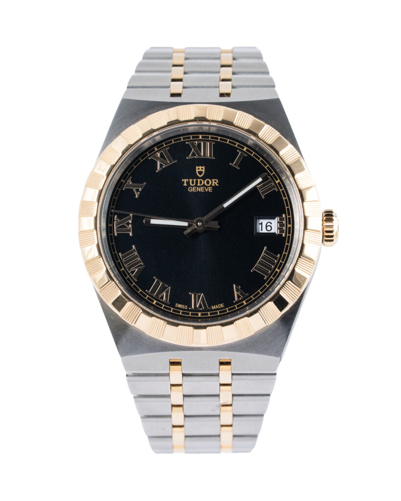 Pre-Owned Tudor Royal 28503 Black Roman Stainless Steel & Yellow Gold – 2025. 38mm stainless steel case, yellow gold bezel. Crown set on the right side of the watch as well as the date. Black Roman dial, stainless steel bracelet covered by yellow gold caps. Complete with original box & papers.