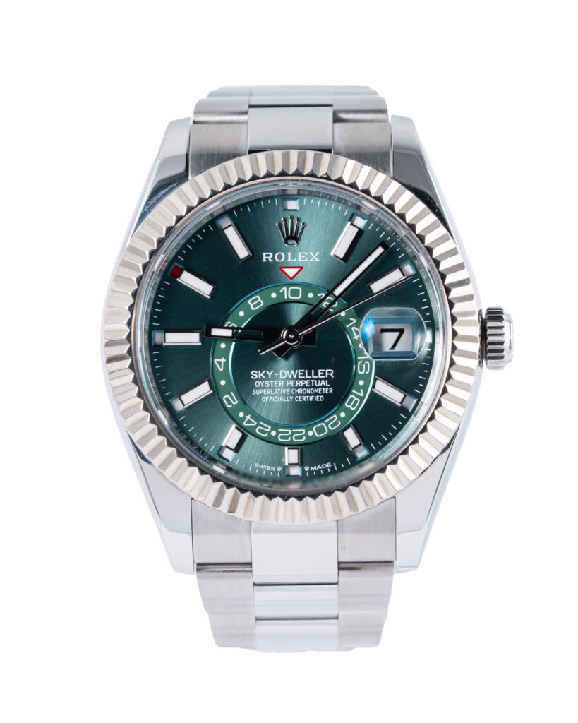 Pre-Owned Rolex Sky-Dweller 336934 Green Dial Stainless Steel & White Gold 42mm – 2023. 42mm stainless steel case, white gold fluted bezel. Crown set on the right side of the watch as well as the date. Green dial, stainless steel oyster bracelet. Complete with original box & papers.