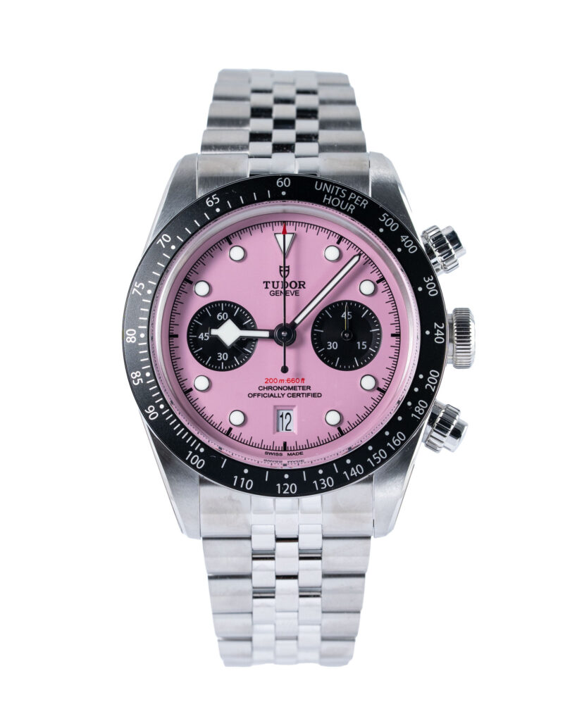 Make: Tudor Reference: 79360N Model: Black Bay Chronograph Case: Steel Bracelet: Bracelet Size: 41mm Dial colour: Pink Bezel: Aluminum (AL) Year: 10/2025 Condition: Unworn Box papers : Paperwork/box