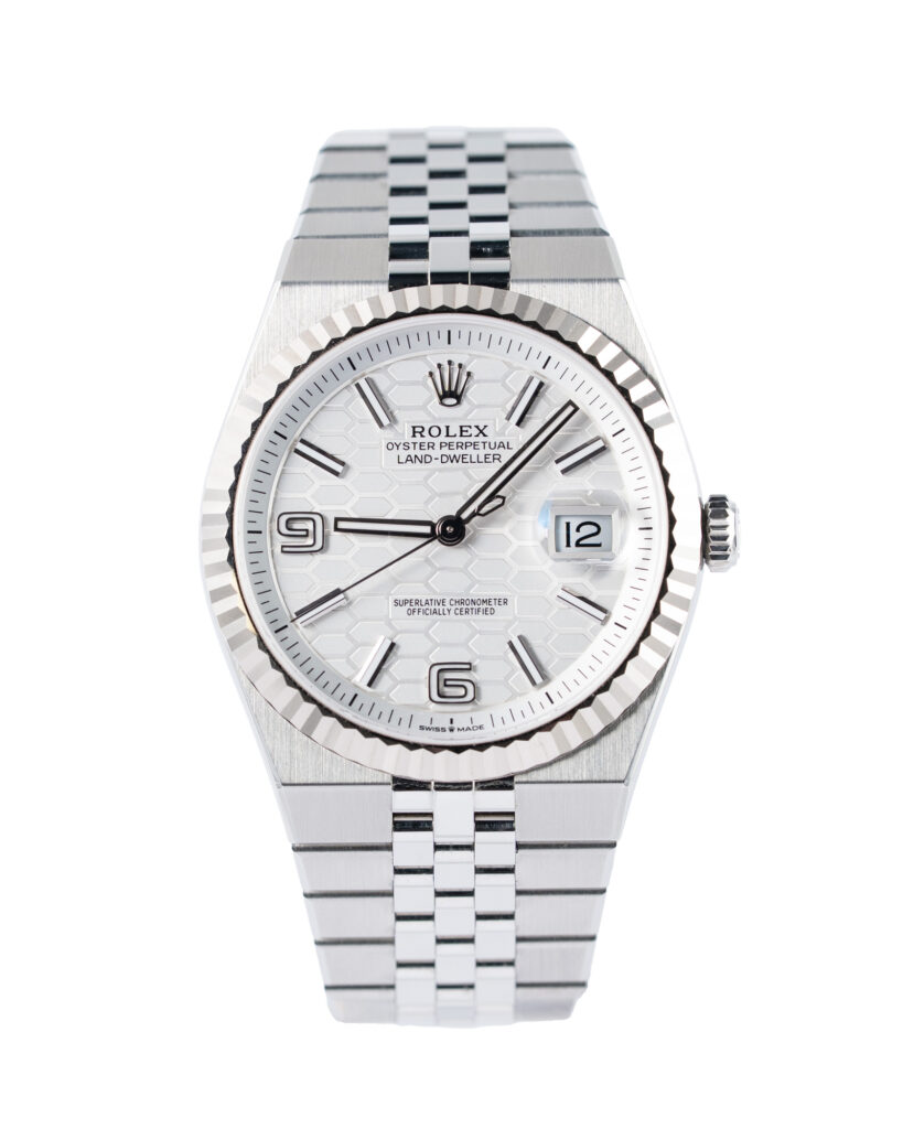 Make: Rolex Reference: 127334 Model: Land-Dweller Case: Steel Bracelet: Bracelet Size: 40mm Dial colour: White Bezel: Fluted Year: 09/2025 Condition: Pre Owned Box papers : Paperwork/box