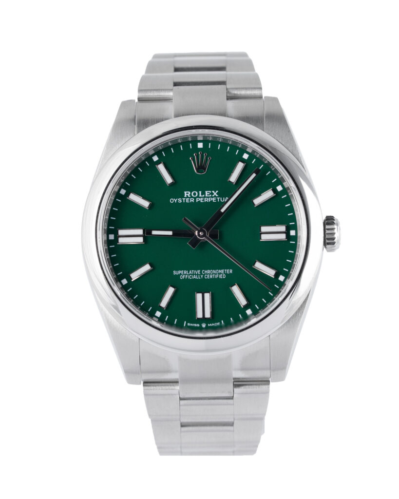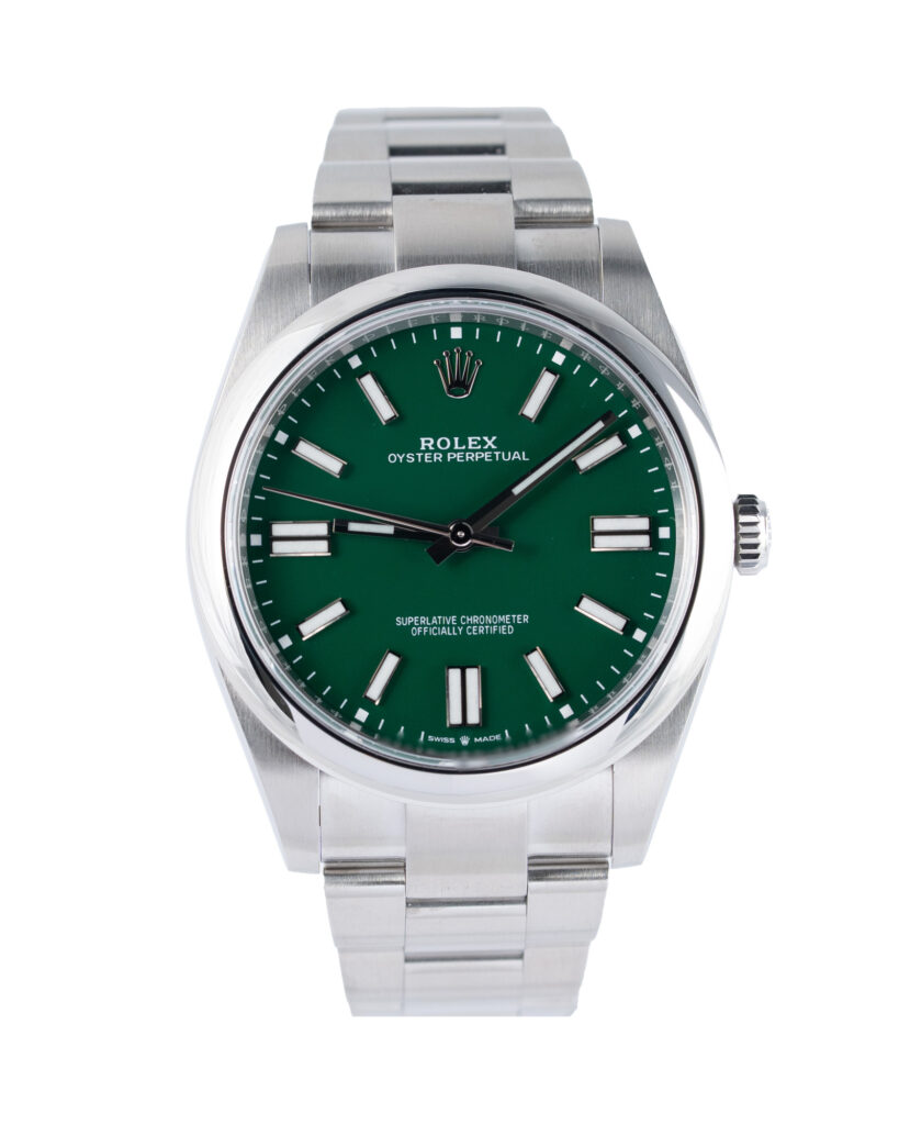 Make: Rolex Reference: 124300 Model: Oyster Perpetral 41 Case: Stainless Steel (SS) Bracelet: Oyster Size: 41mm Dial colour: Green Year: 05/2022 Condition: Pre Owned Box papers : Paperwork/box