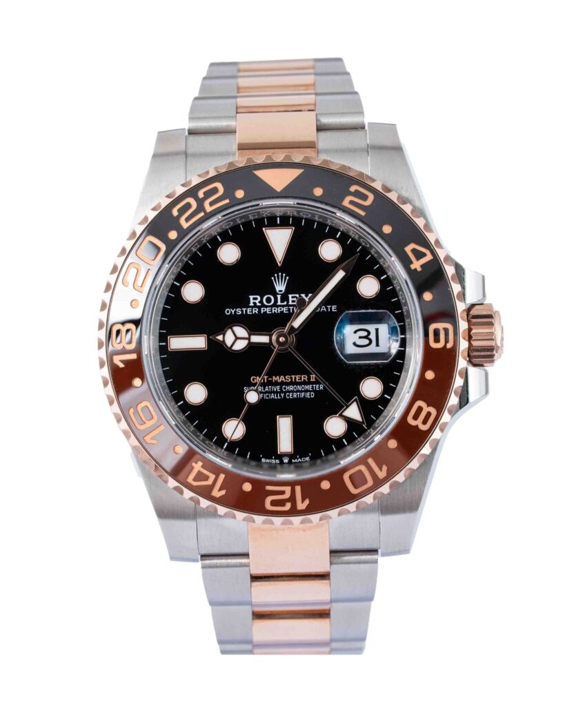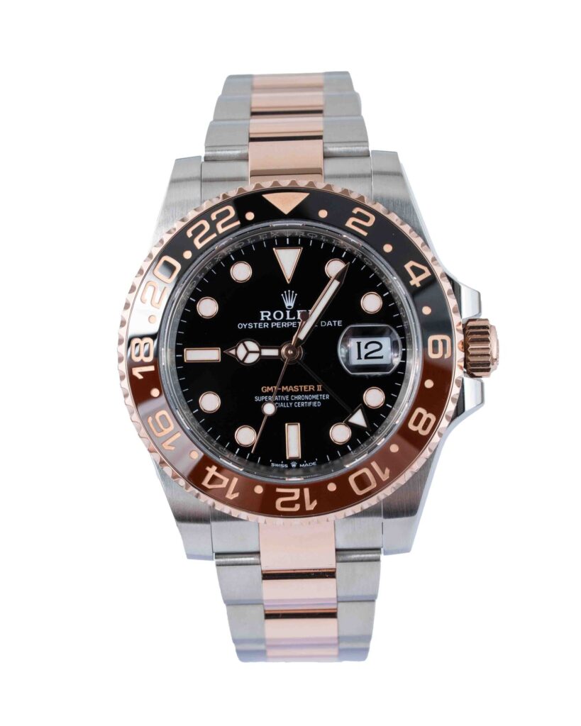 brand: Rolex Reference: 126711CHNR Model: GMT-Master II case MATERIAL: Steel & Rose Gold strap: Bracelet case Size (MM): 40mm Dial colour: Black Bezel: Ceramic Year: 05/2023 Condition: Excellent Box papers : Paperwork/box