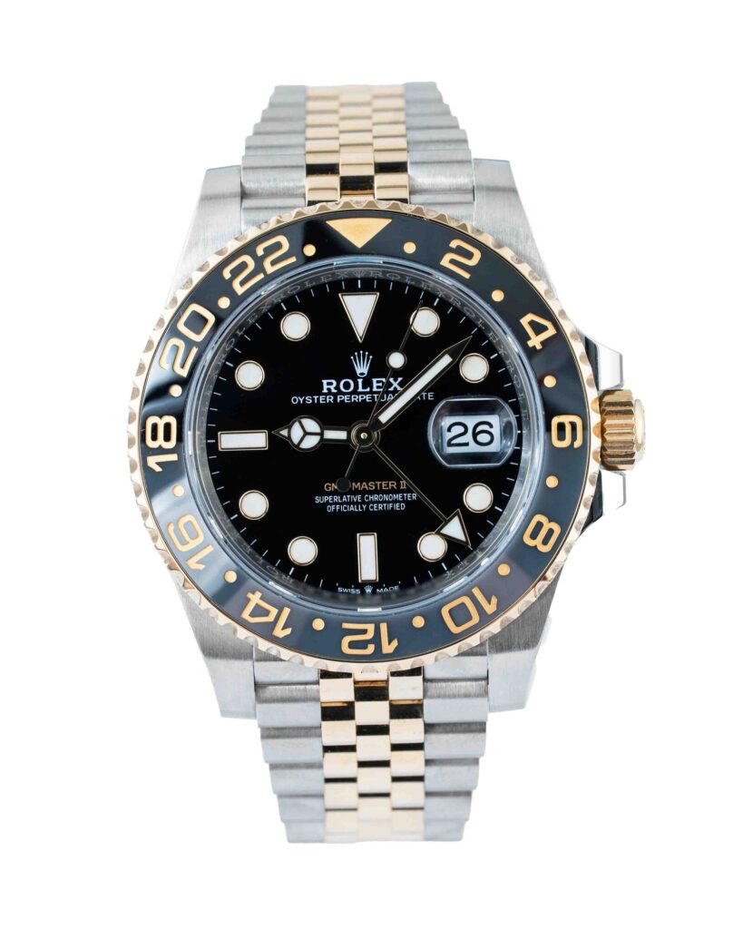 brand: Rolex Reference: 126713GRNR Model: GMT-Master II case MATERIAL: Steel & Yellow Gold strap: Bracelet case Size (MM): 40mm Dial colour: Black Bezel: Ceramic Year: 07/2024 Condition: Excellent Box papers : Paperwork/box