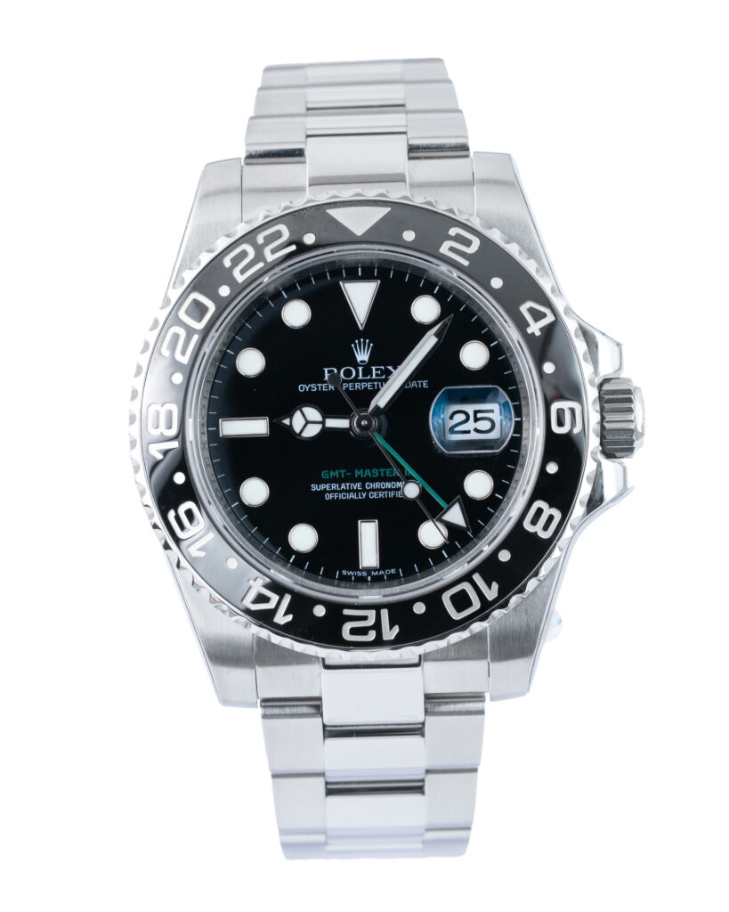 brand: Rolex Reference: 116710LN Model: GMT-Master II case MATERIAL: Steel strap: Bracelet case Size (MM): 40mm Dial colour: Black Bezel: Ceramic Year: 08/2010 Condition: Excellent Box papers : Paperwork/box