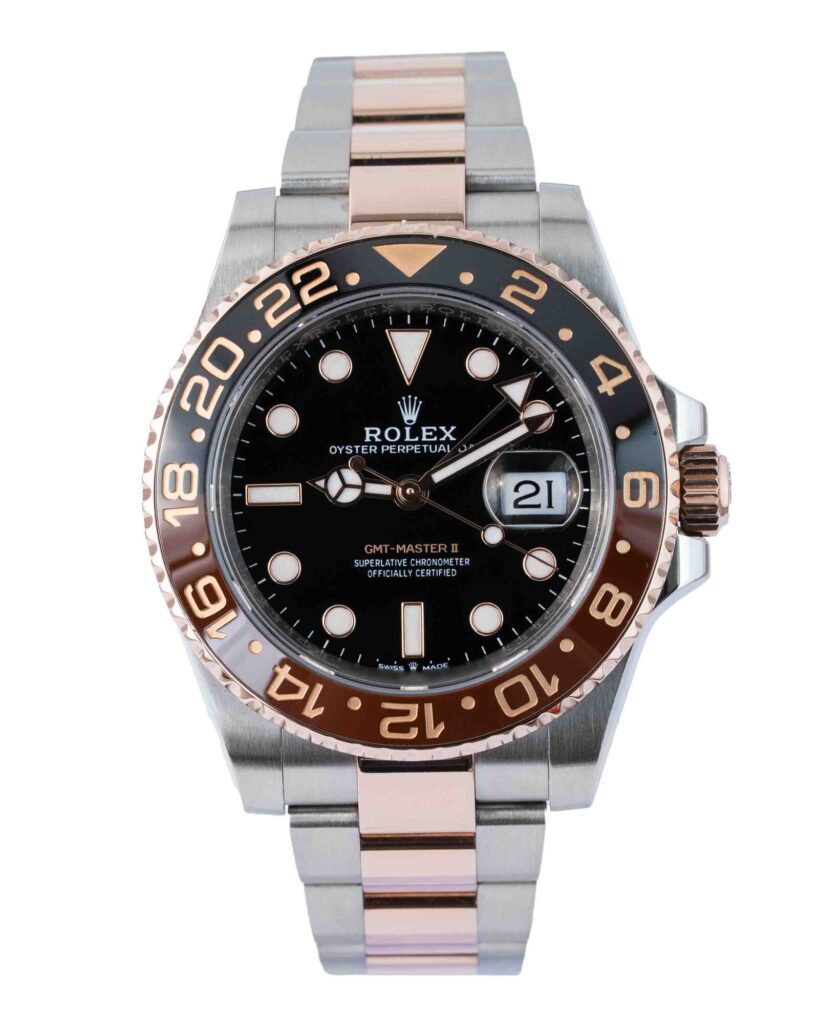 brand: Rolex Reference: 126711CHNR Model: GMT-Master II case MATERIAL: Steel & Rose Gold strap: Bracelet case Size (MM): 40mm Dial colour: Black Bezel: Ceramic Year: 08/2023 Condition: Excellent Box papers : Paperwork/box