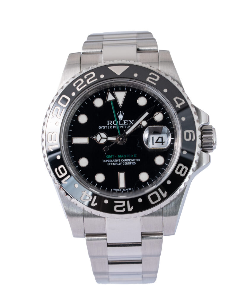 brand: Rolex Reference: 116710BLNR Model: GMT-Master II case MATERIAL: Steel strap: Bracelet case Size (MM): 40mm Dial colour: Black Bezel: Ceramic Year: 01/2014 Condition: Excellent Box papers : Paperwork/box