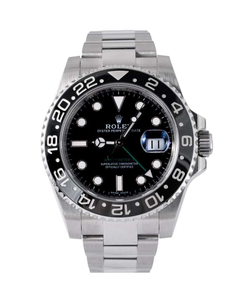 brand: Rolex Reference: 116710LN Model: GMT-Master II case MATERIAL: Steel strap: Bracelet case Size (MM): 40mm Dial colour: Black Bezel: Ceramic Condition: Excellent Box papers : Paperwork/box