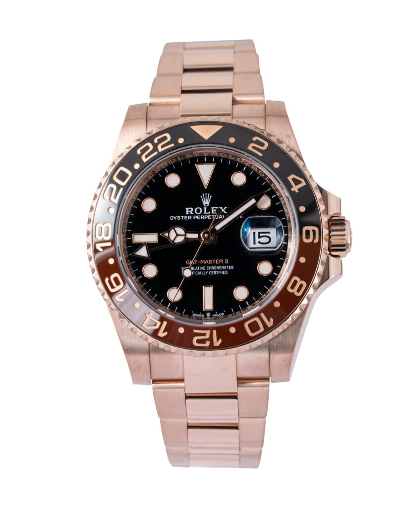 brand: Rolex Reference: 126715CHNR Model: GMT-Master II case MATERIAL: Rose Gold strap: Bracelet case Size (MM): 40mm Dial colour: Black Bezel: Ceramic Condition: Excellent Box papers : Paperwork/box