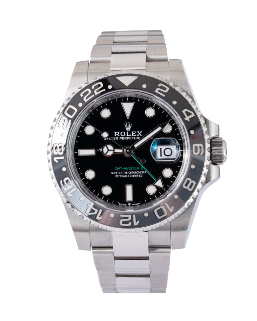 brand: Rolex Reference: 126710BLNR Model: GMT-Master II case MATERIAL: Steel strap: Bracelet case Size (MM): 40mm Dial colour: Black Bezel: Ceramic Condition: Excellent Box papers : Paperwork/box