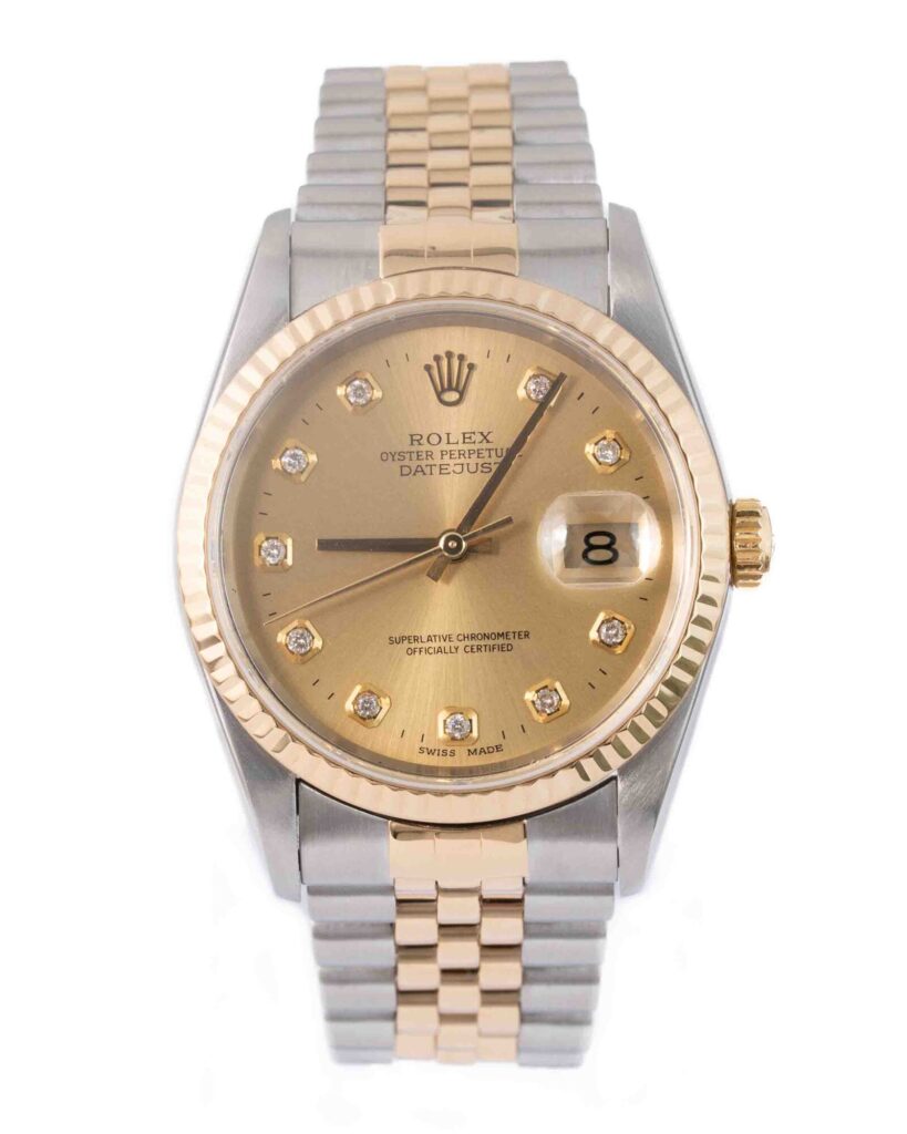 brand: Rolex Reference: 16233 Model: Datejust case MATERIAL: Steel & Yellow Gold strap: Bracelet case Size (MM): 36mm Dial colour: Champagne Bezel: Yellow Gold Year: 02/1997 Condition: Excellent Box papers : Box