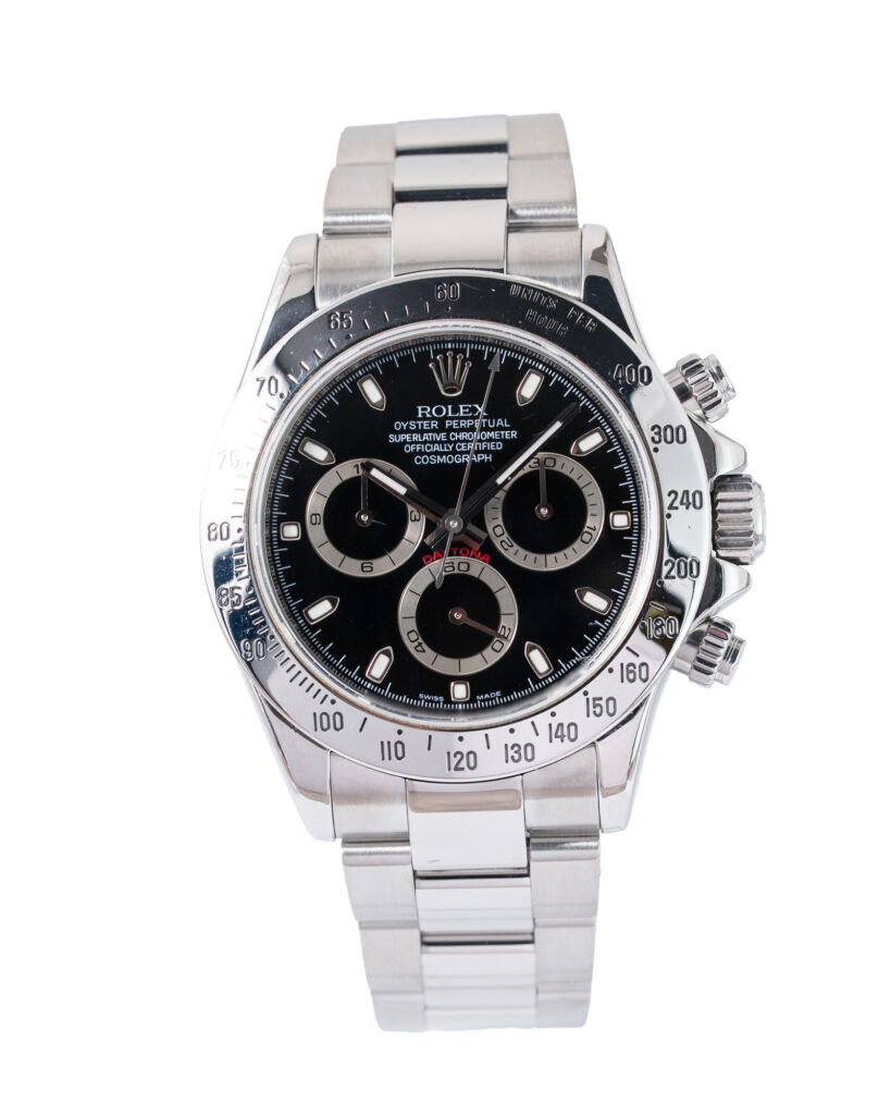 brand: Rolex Reference: 116520 Model: Daytona case MATERIAL: Steel strap: Bracelet case Size (MM): 40mm Dial colour: Black Bezel: Steel Condition: Excellent Box papers : Service Paper/box