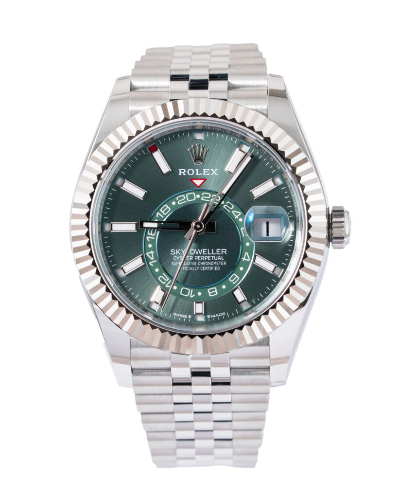 brand: Rolex Reference: 336934 Model: Sky-Dweller case MATERIAL: Steel strap: Bracelet case Size (MM): 42mm Dial colour: Green Bezel: White Gold Year: 12/2025 Condition: Unworn Box papers : Paperwork/box