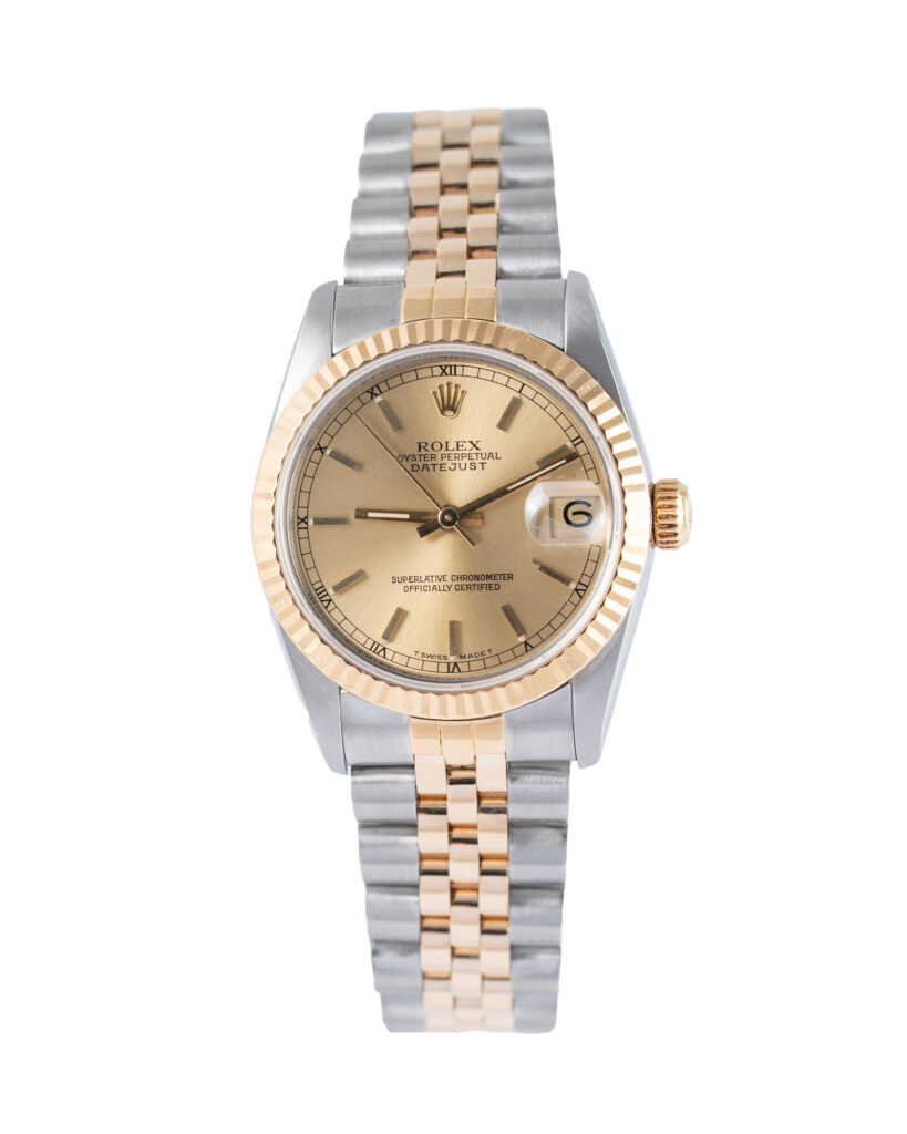 Pre-Owned Rolex Datejust 31 Champagne Baton Stainless Steel & Yellow Gold 31mm – 68273 31mm Stainless Steel & Yellow Gold Case, Fluted Bezel, Crown Set On The Right Side As Well As The Date. Independent 12 hour Hand, Champagne Baton Dial, Stainless Steel & Yellow Gold Jubilee Bracelet. Complete With Original Box & Papers.