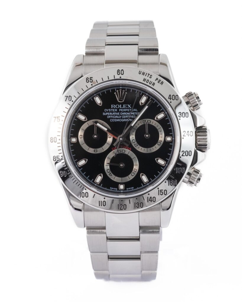 brand: Rolex Reference: 116520 Model: Daytona case MATERIAL: Steel strap: Bracelet case Size (MM): 40mm Dial colour: Black Bezel: Steel Year: 10/2006 Condition: Excellent Box papers : Paperwork/box