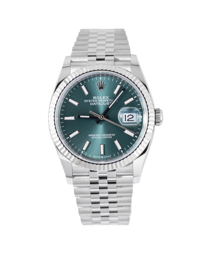 brand: Rolex Reference: 126234 Model: Datejust case MATERIAL: Steel strap: Bracelet case Size (MM): 36mm Dial colour: Green Bezel: White Gold Year: 11/2025 Condition: Unworn Box papers : Paperwork/box