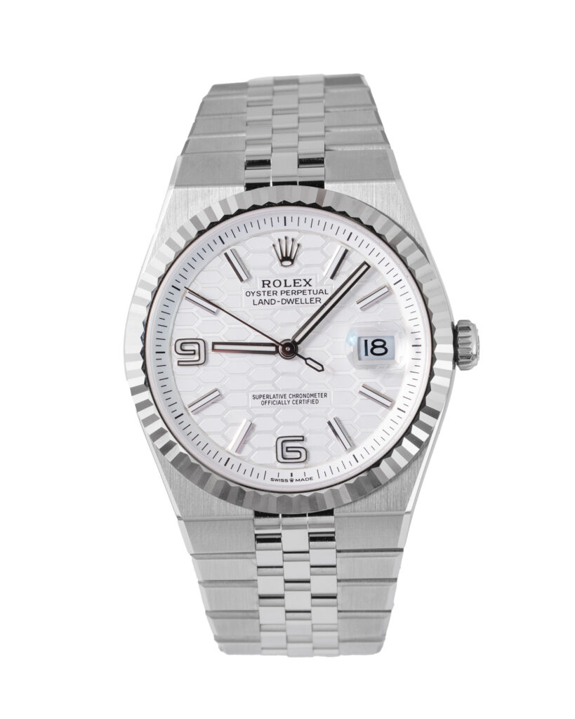 brand: Rolex Reference: 127334 Model: Land-Dweller case MATERIAL: Steel strap: Bracelet case Size (MM): 40mm Dial colour: White Bezel: White Gold Year: 09/2025 Condition: Unworn Box papers : Paperwork/box