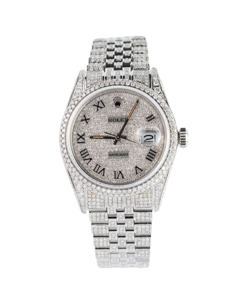 brand: Rolex Reference: 16014 Model: Datejust case MATERIAL: Steel strap: Bracelet case Size (MM): 36mm Dial colour: Diamond Bezel: Diamond Condition: Good Box papers : Box