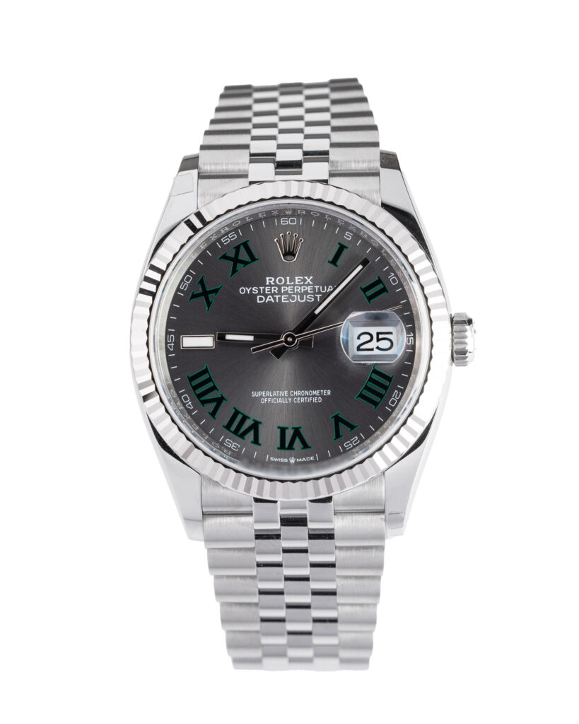 brand: Rolex Reference: 126234 Model: Datejust case MATERIAL: Steel strap: Bracelet case Size (MM): 36mm Dial colour: Grey Bezel: White Gold Year: 08/2025 Condition: Unworn Box papers : Paperwork/box