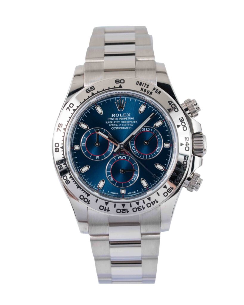 brand: Rolex Reference: 116509 Model: Daytona case MATERIAL: White Gold strap: Bracelet case Size (MM): 40mm Dial colour: Blue Bezel: White Gold Year: 08/2020 Condition: Excellent Box papers : Paperwork/box
