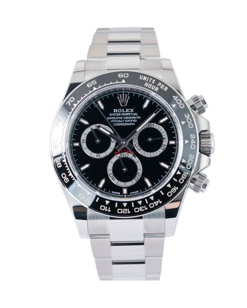 brand: Rolex Reference: 126500LN Model: Daytona case MATERIAL: Steel strap: Bracelet case Size (MM): 40mm Dial colour: Black Bezel: Ceramic Year: 11/2025 Condition: Unworn Box papers : Paperwork/box