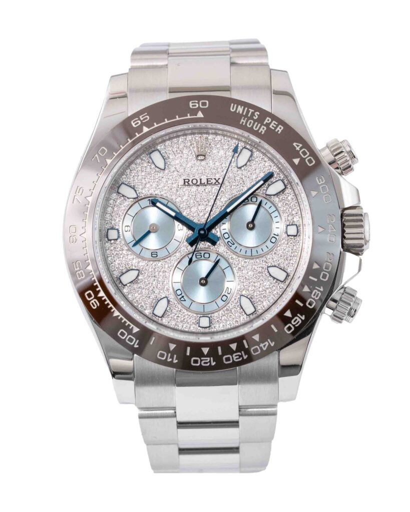 brand: Rolex Reference: 116506 Model: Daytona case MATERIAL: Platinum strap: Bracelet case Size (MM): 40mm Dial colour: Diamond Bezel: Ceramic Condition: Excellent Box papers : Paperwork/box