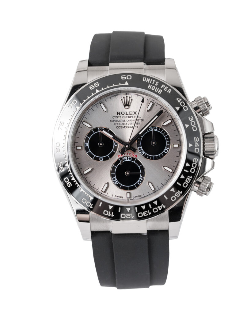 brand: Rolex Reference: 126519LN Model: Daytona case MATERIAL: White Gold strap: Rubber case Size (MM): 40mm Dial colour: Silver Bezel: Ceramic Year: 05/2024 Condition: Excellent Box papers : Paperwork/box