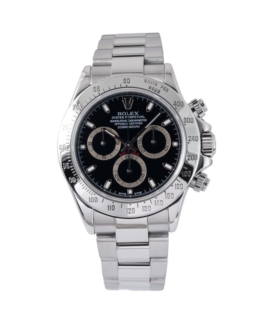 brand: Rolex Reference: 116520 Model: Daytona case MATERIAL: Steel strap: Bracelet case Size (MM): 40mm Dial colour: Black Bezel: Steel Condition: Good Box papers : Box