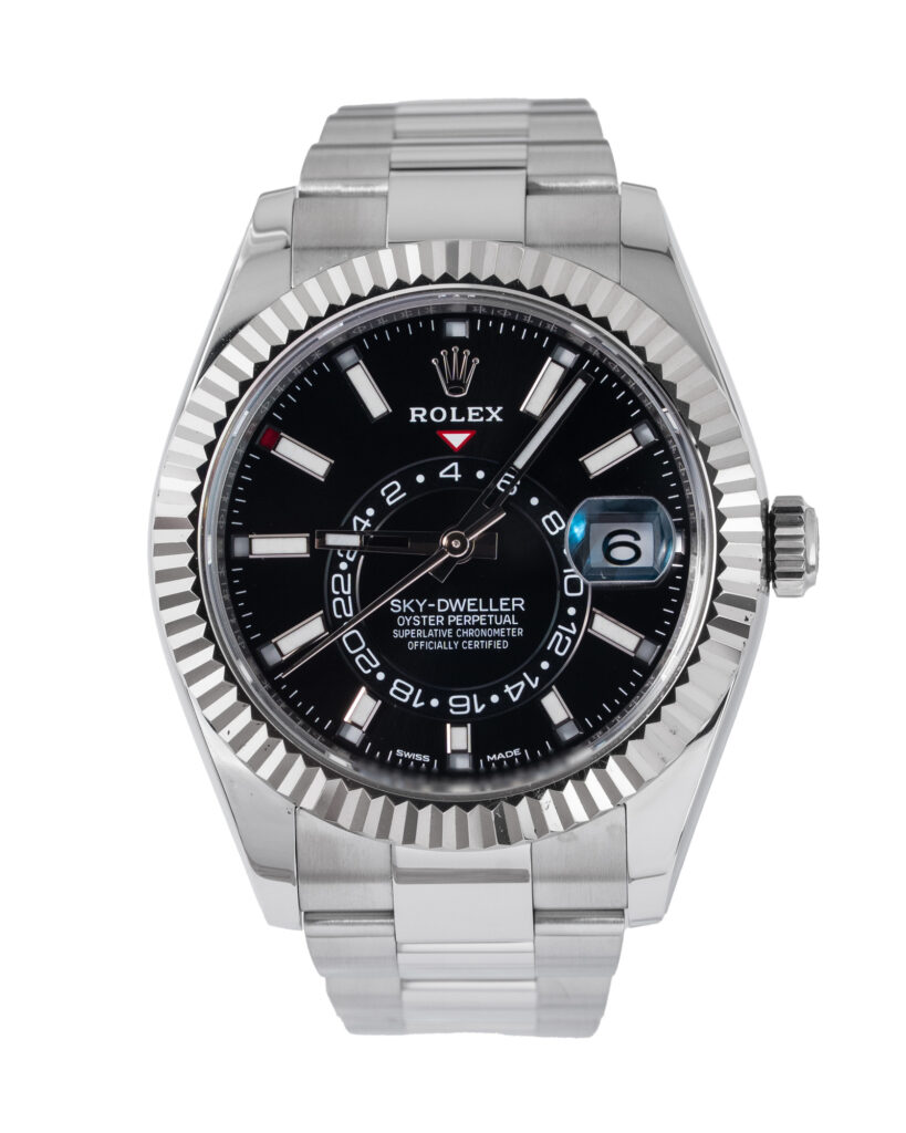 brand: Rolex Reference: 326934 Model: Sky-Dweller case MATERIAL: Steel strap: Bracelet case Size (MM): 42mm Dial colour: Black Bezel: White Gold Year: 11/2020 Condition: Excellent Box papers : Paperwork/box