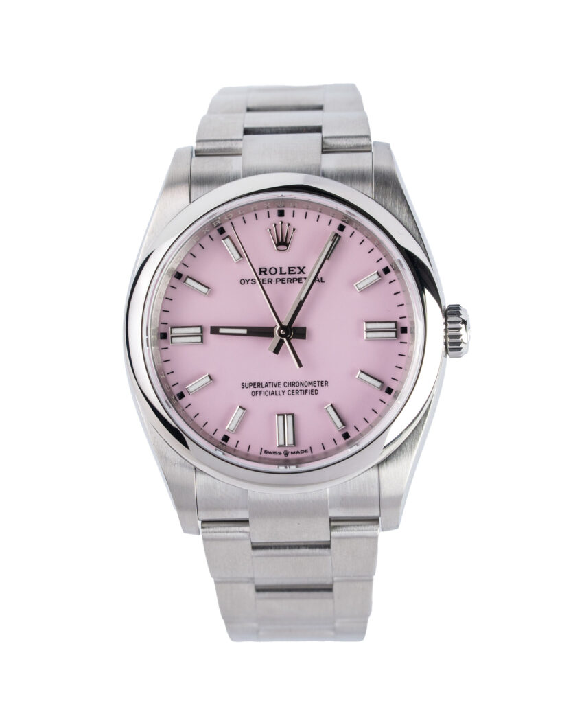 brand: Rolex Reference: 126000 Model: Oyster Perpetual case MATERIAL: Steel strap: Bracelet case Size (MM): 36mm Dial colour: Pink Bezel: Steel Year: 11/2025 Condition: Unworn Box papers : Paperwork/box