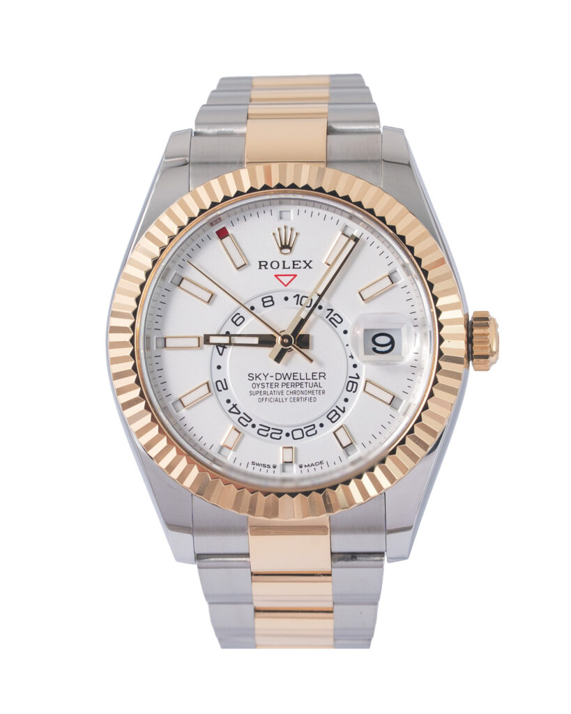 brand: Rolex Reference: 336933 Model: Sky-Dweller case MATERIAL: Steel & Yellow Gold strap: Bracelet case Size (MM): 42mm Dial colour: White Bezel: Yellow Gold Year: 06/2024 Condition: Excellent Box papers : Paperwork/box