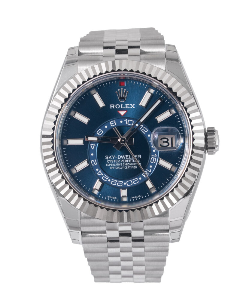 brand: Rolex Reference: 326934 Model: Sky-Dweller case MATERIAL: Steel strap: Bracelet case Size (MM): 42mm Dial colour: Blue Bezel: White Gold Year: 03/2023 Condition: Unworn Box papers : Paperwork/box