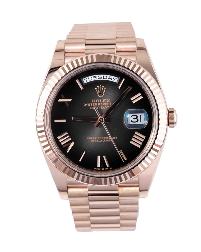 brand: Rolex Reference: 228235 Model: Day-Date case MATERIAL: Rose Gold strap: Bracelet case Size (MM): 40mm Dial colour: Grey Bezel: Rose Gold Year: 11/2025 Condition: Unworn Box papers : Paperwork/box