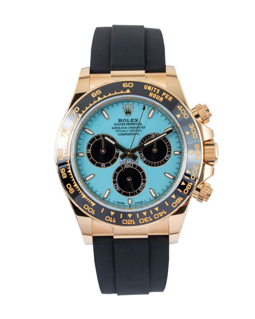 brand: Rolex Reference: 126518LN Model: Daytona case MATERIAL: Yellow Gold strap: Rubber case Size (MM): 40mm Dial colour: Blue Bezel: Ceramic Year: 09/2025 Condition: Excellent Box papers : Paperwork/box